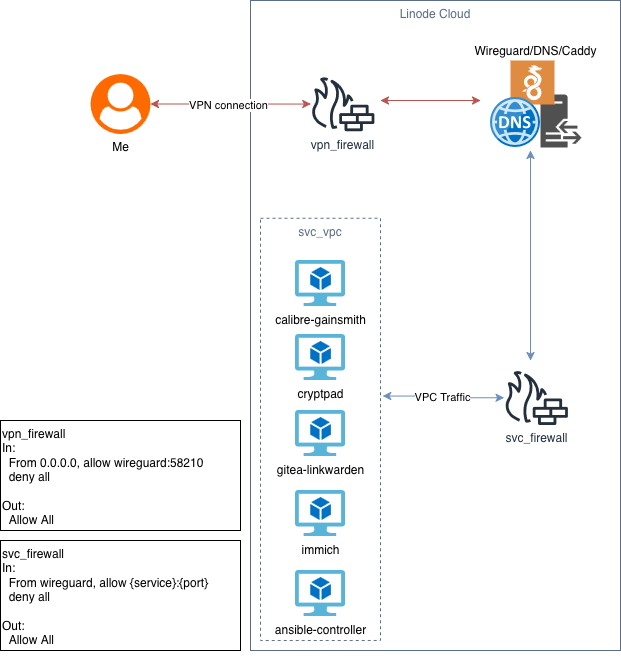 We then have our ‘svc_vpc’ to handle all inter-VM traffic. With this, we also do not give any of the VMs a public IP address, but they can still connect to the internet via a NAT connection. In addition, the firewall only accepts the requisite port connections from the Caddy server.